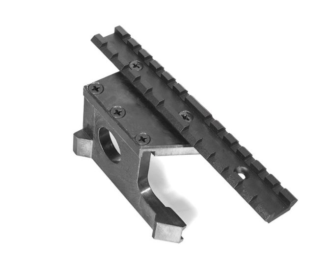 Fixation complète en acier fabriquée en Russie . Les petites vis de fixation du rail sur l'arme ne sont pas fournies. Le diamètre perçage/taraudage conseillé du boitier est de 5 mm , pas standard de 0,8 .